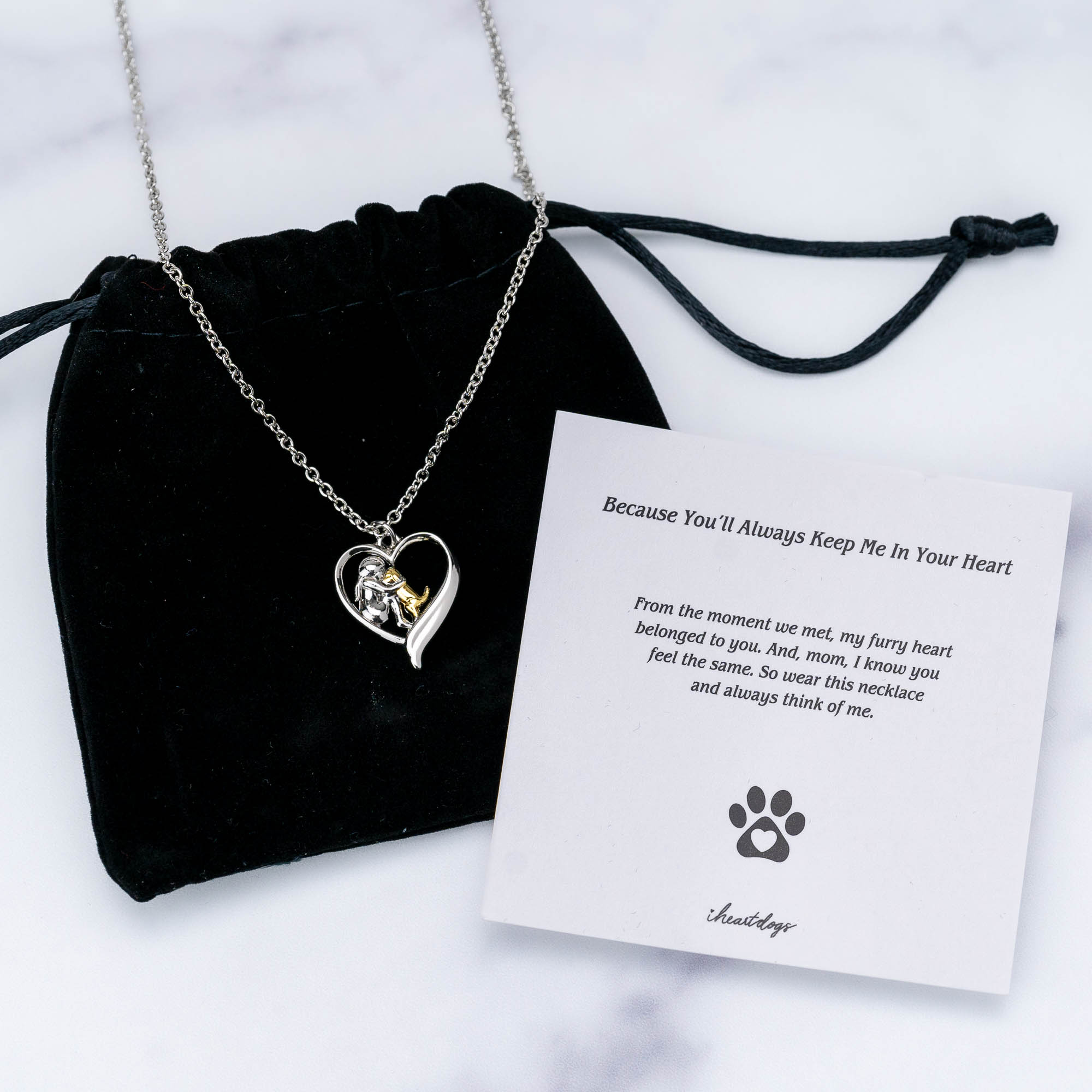 Always By My Side & Forever In My Heart Necklace includes a stainless steel heart surrounding a woman and her dog sharing a tender moment, this dog-inspired jewelry represents the bond between you and your darling dog. The delicate design tells the story of your love in fine detail without being over large. And strung on a 22-inch chain, the pendant hangs at a long enough length that it won’t fit tight on the throat or get lost in your clothes.