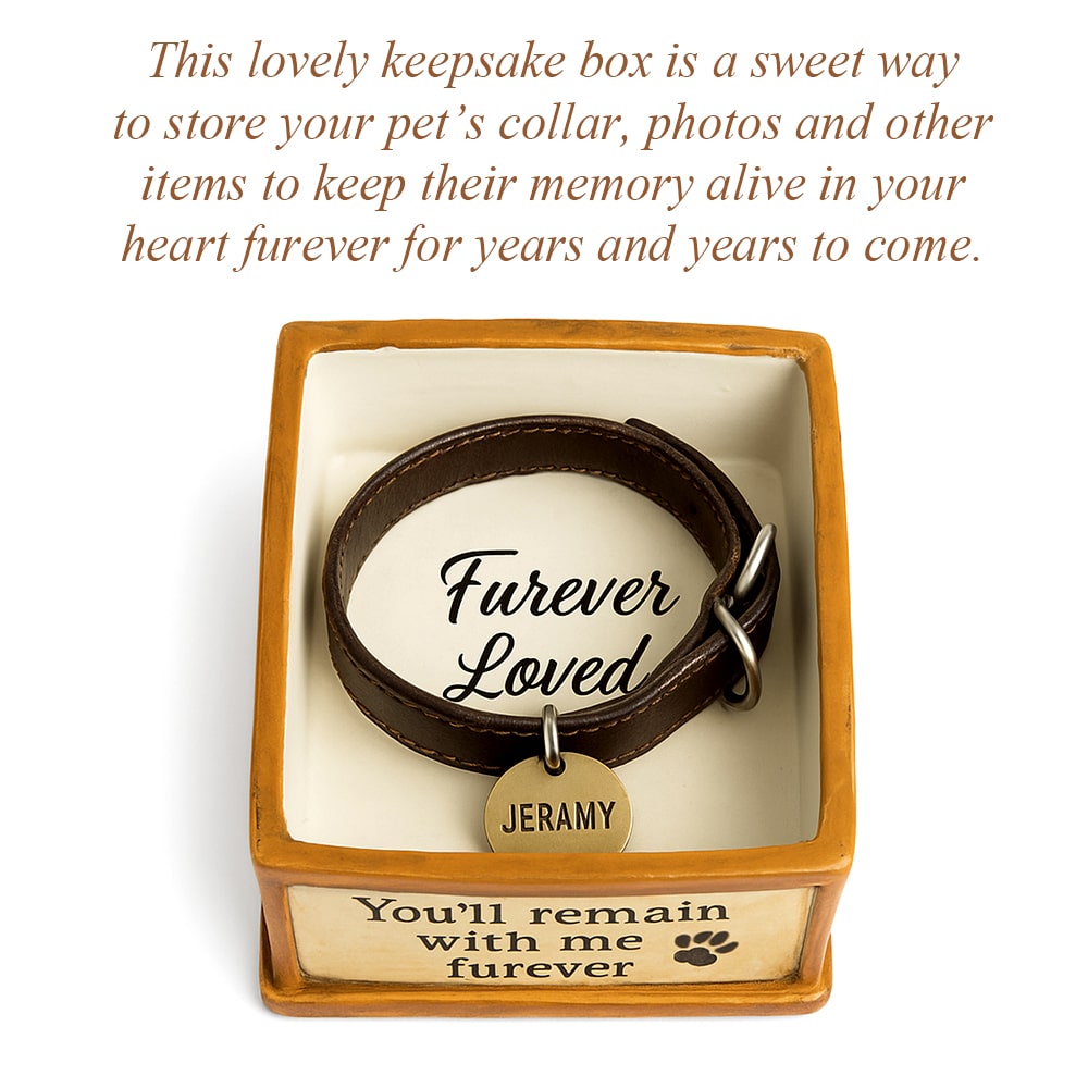 Honor the lasting bond with your cherished furry friend through this beautifully crafted 4-inch resin keepsake box. Elegantly sculpted, it features a lifelike dog figurine resting peacefully atop the lid, accompanied by the tender inscription: “You’ll remain with me forever.” This touching message offers comfort and a gentle reminder of the love that never fades.